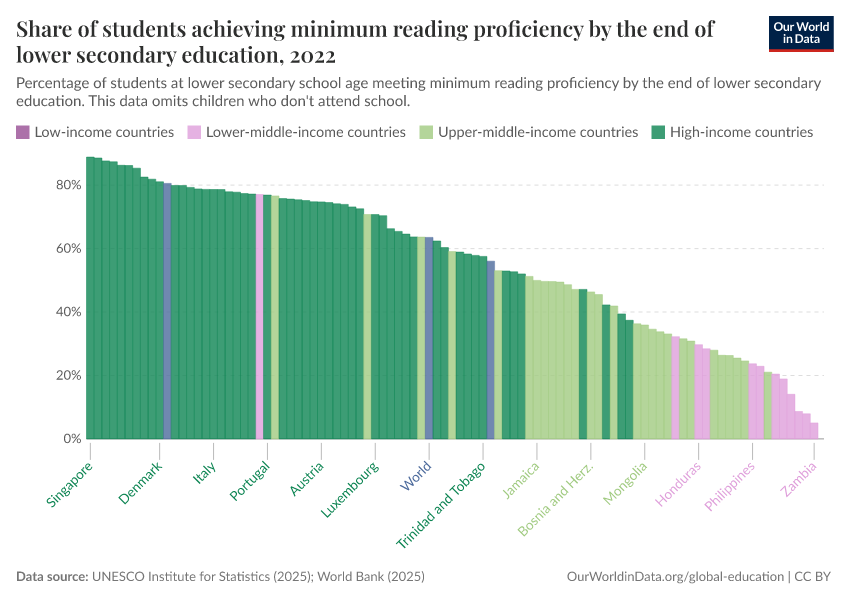“Data Page: Share of students achieving minimum reading proficiency by the end of lower secondary education”, part of the following publication: Hannah Ritchie, Veronika Samborska, Esteban Ortiz-Ospina, and Max Roser (2023) - “Global Education”. Data adapted from UNESCO Institute for Statistics. Retrieved from https://auto-wildfires.owid.pages.dev:8789/20260122-091445/grapher/share-of-students-at-end-of-lower-secondary-education-with-minimum-reading-proficiency.html [online resource] (archived on January 22, 2026).How to cite this data