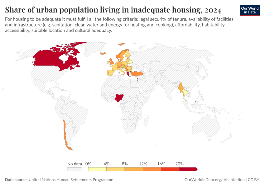 “Data Page: Share of urban population living in inadequate housing”. Our World in Data (2026). Data adapted from United Nations Human Settlements Programme. Retrieved from https://auto-wildfires.owid.pages.dev:8789/20251120-211749/grapher/share-of-urban-population-living-in-inadequate-housing.html [online resource] (archived on November 20, 2025).How to cite this data