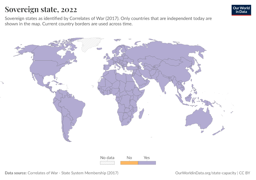 “Data Page: Sovereign state”, part of the following publication: Bastian Herre and Pablo Arriagada (2023) - “State Capacity”. Data adapted from Correlates of War. Retrieved from https://auto-wildfires.owid.pages.dev:8789/20260224-080822/grapher/sovereign-state-cow.html [online resource] (archived on February 24, 2026).How to cite this data