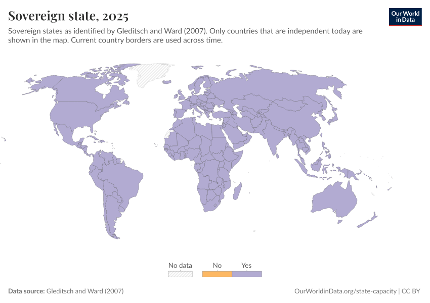 “Data Page: Sovereign state”, part of the following publication: Bastian Herre and Pablo Arriagada (2023) - “State Capacity”. Data adapted from Gleditsch and Ward. Retrieved from https://auto-wildfires.owid.pages.dev:8789/20260119-070102/grapher/sovereign-state-gleditsch-ward.html [online resource] (archived on January 19, 2026).How to cite this data