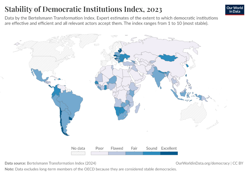 “Data Page: Stability of Democratic Institutions Index”, part of the following publication: Bastian Herre, Lucas Rodés-Guirao, and Esteban Ortiz-Ospina (2013) - “Democracy”. Data adapted from Bertelsmann Transformation Index. Retrieved from https://auto-wildfires.owid.pages.dev:8789/20260105-133053/grapher/stability-democratic-institutions-index-bti.html [online resource] (archived on January 5, 2026).How to cite this data