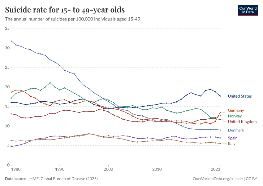 “Data Page: Suicide rate for 15- to 49-year olds”, part of the following publication: Esteban Ortiz-Ospina and Max Roser (2016) - “Global Health”. Data adapted from IHME, Global Burden of Disease. Retrieved from https://auto-wildfires.owid.pages.dev:8789/20260211-174736/grapher/suicide-rate-for-15--to-49-year-olds.html [online resource] (archived on February 11, 2026).How to cite this data
