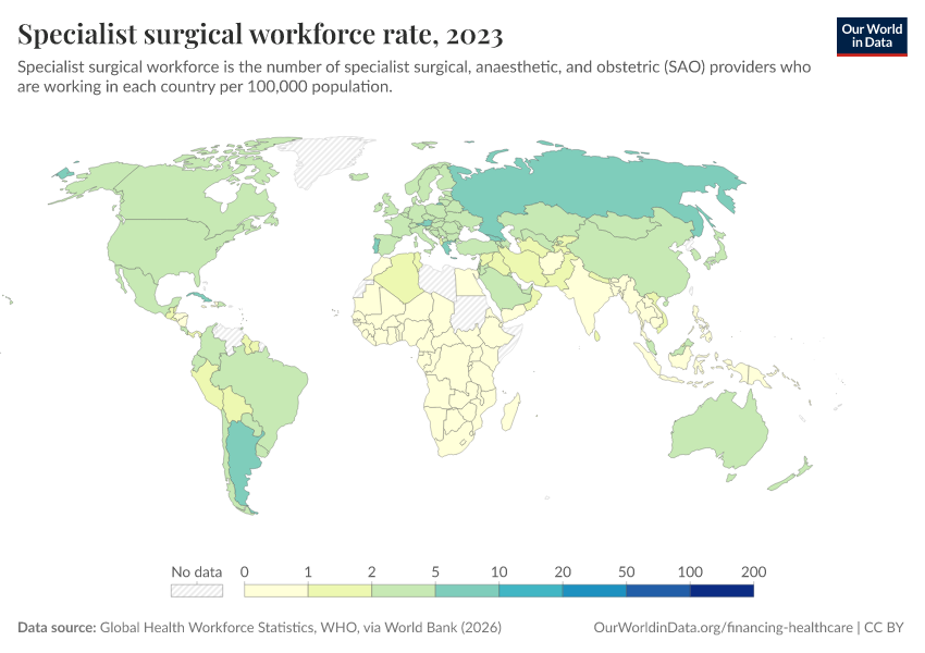 “Data Page: Specialist surgical workforce rate”. Our World in Data (2026). Data adapted from Lancet Commission on Global Surgery, WHO, and BMJ Global Health, via World Bank. Retrieved from https://auto-wildfires.owid.pages.dev:8789/20260202-181317/grapher/surgeons-per-100000.html [online resource] (archived on February 2, 2026).How to cite this data