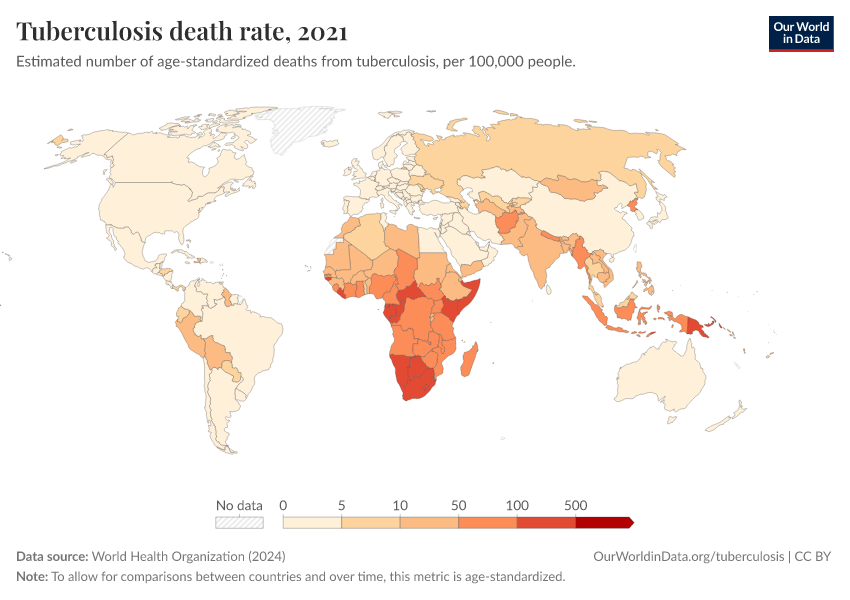 World Health Organization (2024) – with major processing by Our World in Data. “Tuberculosis death rate” [dataset]. World Health Organization, “Global Health Estimates” [original data]. Retrieved March 2, 2026 from https://auto-wildfires.owid.pages.dev:8789/20250909-093708/grapher/tuberculosis-death-rate-age-standardized.html (archived on September 9, 2025).