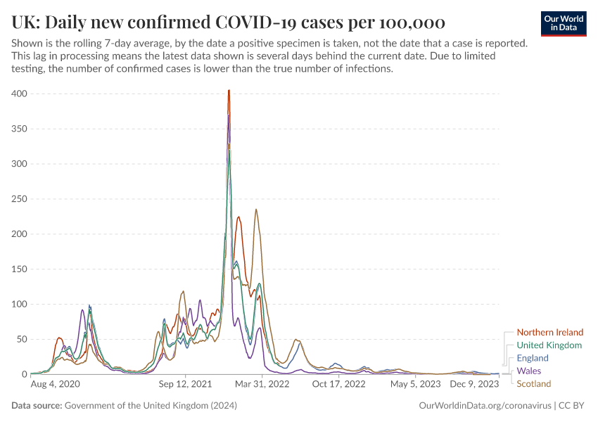 Government of the United Kingdom (2024) – with minor processing by Our World in Data. “UK: Daily new confirmed COVID-19 cases per 100,000” [dataset]. Government of the United Kingdom, “UKHSA data dashboard” [original data]. Retrieved March 2, 2026 from https://auto-wildfires.owid.pages.dev:8789/20250909-093708/grapher/uk-daily-covid-cases-7day-average.html (archived on September 9, 2025).