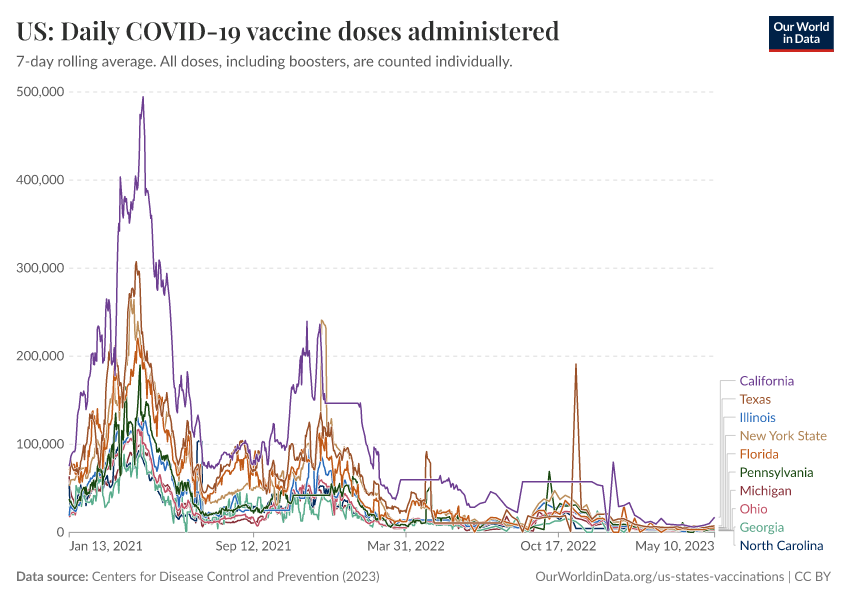 Centers for Disease Control and Prevention (2023) – processed by Our World in Data. “US: Daily COVID-19 vaccine doses administered” [dataset]. Centers for Disease Control and Prevention, “COVID-19, Vaccinations (United States)” [original data]. Retrieved March 2, 2026 from https://auto-wildfires.owid.pages.dev:8789/20250909-093708/grapher/us-daily-covid-vaccine-doses-administered.html (archived on September 9, 2025).
