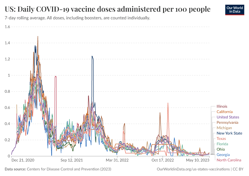 Centers for Disease Control and Prevention (2023) – processed by Our World in Data. “US: Daily COVID-19 vaccine doses administered per 100 people” [dataset]. Centers for Disease Control and Prevention, “COVID-19, Vaccinations (United States)” [original data]. Retrieved March 2, 2026 from https://auto-wildfires.owid.pages.dev:8789/20250909-093708/grapher/us-daily-covid-vaccine-doses-per-100.html (archived on September 9, 2025).