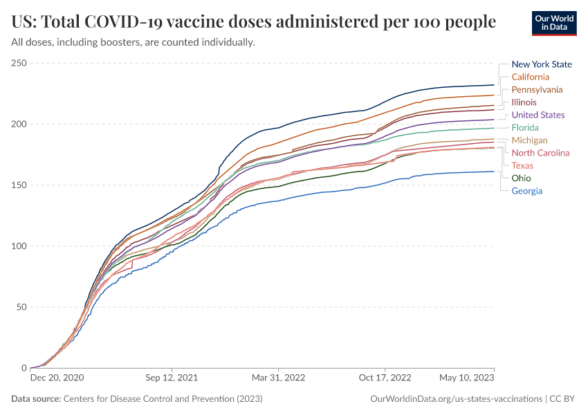 Centers for Disease Control and Prevention (2023) – processed by Our World in Data. “US: Total COVID-19 vaccine doses administered per 100 people” [dataset]. Centers for Disease Control and Prevention, “COVID-19, Vaccinations (United States)” [original data]. Retrieved March 2, 2026 from https://auto-wildfires.owid.pages.dev:8789/20250909-093708/grapher/us-state-covid-vaccines-per-100.html (archived on September 9, 2025).