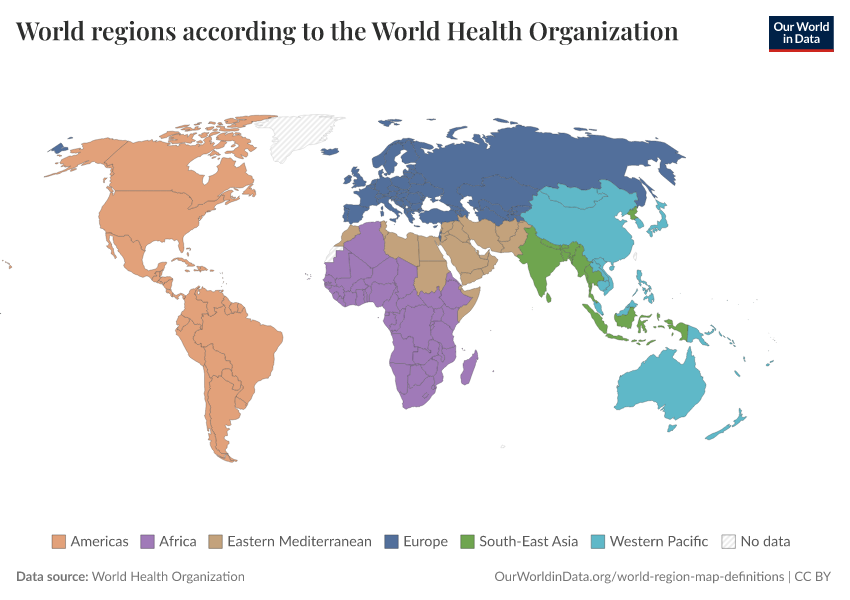 “Data Page: World regions according to the World Health Organization”. Our World in Data (2026). Data adapted from World Health Organization. Retrieved from https://auto-wildfires.owid.pages.dev:8789/20260224-141219/grapher/who-regions.html [online resource] (archived on February 24, 2026).How to cite this data