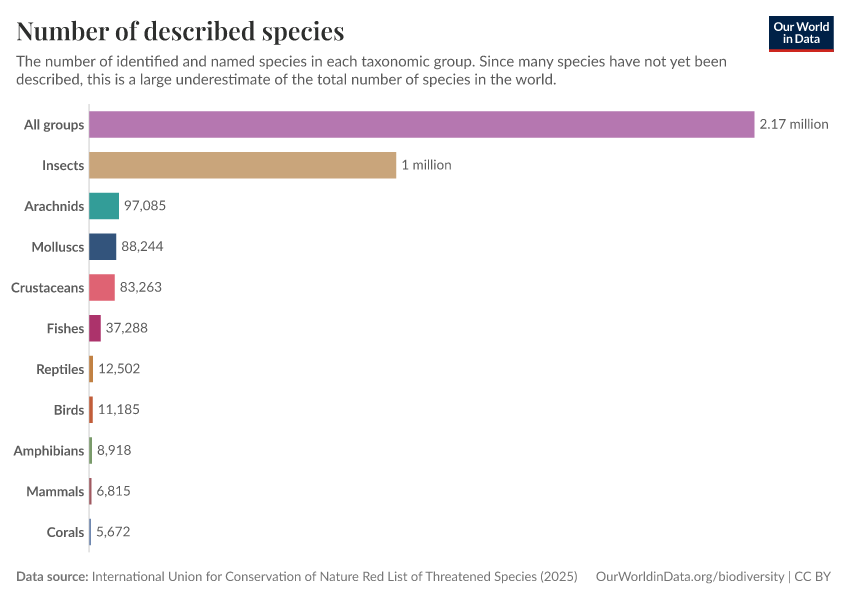 Hannah Ritchie (2022) - “How many species are there?” Published online at OurWorldinData.org. Retrieved from: 'https://auto-wildfires.owid.pages.dev:8789/20260106-083806/how-many-species-are-there.html' [Online Resource] (archived on January 6, 2026).BibTeX citation