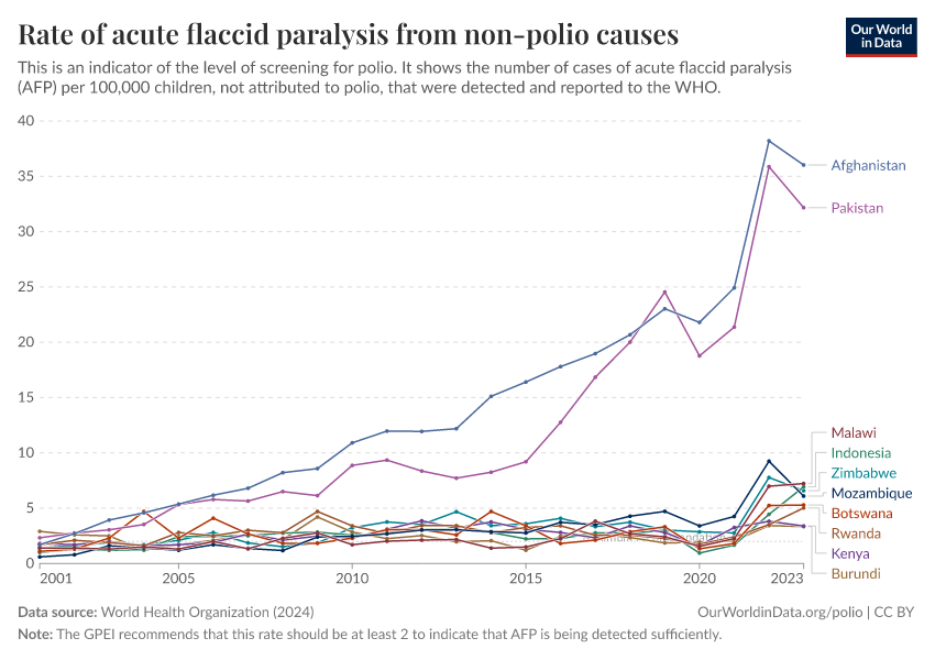 If a country is detecting very few cases of AFP overall, then it suggests it’s not screening enough for paralysis. So, to measure how much screening is ongoing, we can look at how many cases of AFP that are not caused by polio are being detected. This is called the non-polio AFP rate.