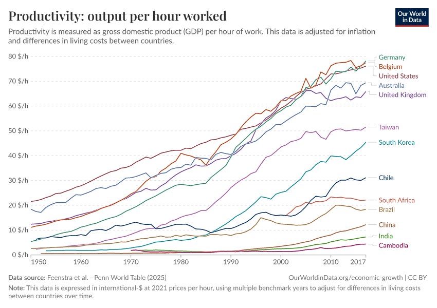 The chart here shows the growth in labor productivity, not just for agriculture but for the entire economy. The technological, economic, and social structures in richer countries have enabled workers there to produce more while working less.