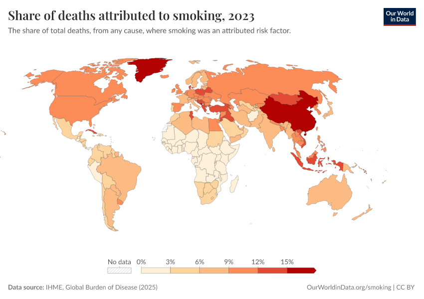 In the map, we see the share of deaths attributed to direct smoking across the world. In many countries, this share is substantial.