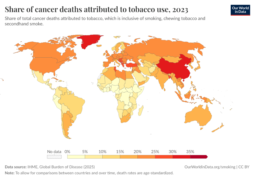The world map shows the Global Burden of Disease estimates of the share of cancer deaths that can be attributed to smoking.