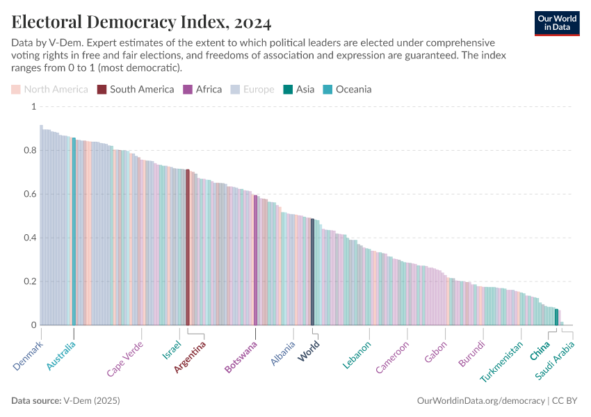 At Our World in Data we primarily use V-Dem’s Electoral Democracy Index to measure democracy.2 The index is used in all of V-Dem’s other democracy indices because V-Dem considers there to be no democracy without elections. The other aspects can therefore be thought of as measuring the quality of a democracy.