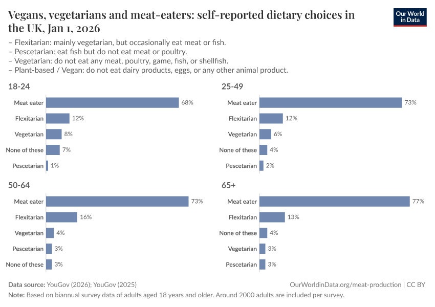 If we want to know about this variation we can rely on survey data on how people describe their dietary preferences. There is, unfortunately, a lack of long-term data on this. But we can look at recent developments.