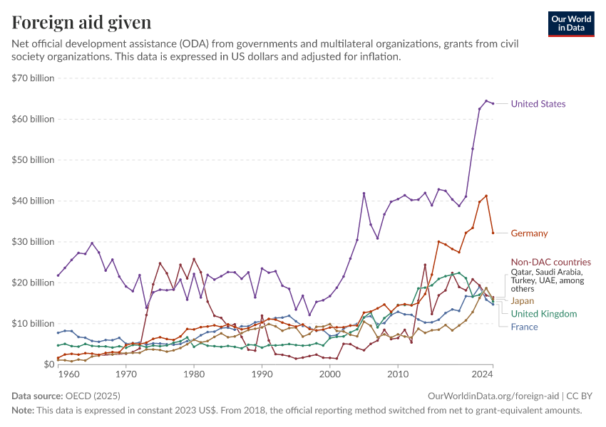 Simon van Teutem and Pablo Arriagada (2025) - “What is foreign aid? How “Official Development Assistance” is measured” Published online at OurWorldinData.org. Retrieved from: 'https://auto-wildfires.owid.pages.dev:8789/20260223-070107/what-is-foreign-aid.html' [Online Resource] (archived on February 23, 2026).BibTeX citation