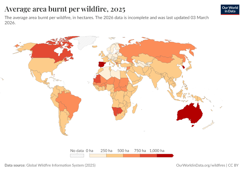 In the chart below, you can explore how the average land area burnt per wildfire varies across different countries and regions. As before, the current year’s data is included but will remain incomplete until the end of the fire season. You can further explore in this scatterplot how the same number of wildfires can lead to significantly different amounts of land being burnt per wildfire.
